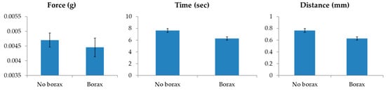 The analysis of the two groups of samples (borax and no borax) did not point out significant differences for the consistency of the eggs (measured in terms of the maximum peak force the instrument applies to achieve eggs breakage).