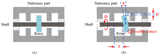 (a) The ideal case, and (b) the real situation of the running rotor. (L: axial clearance; D: radial clearance; α: tilt angle; Ω: angular velocity.).