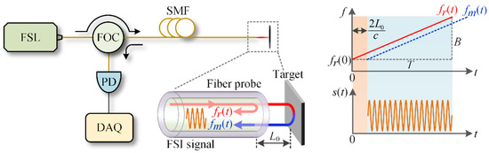 A fiber-optic FSI system is shown in Figure 2; the light wave of the frequency-swept laser (FSL) passes through the fiber-optic circulator (FOC) and reaches the end face of the fiber probe. After the reflections of fiber probe and target, the back-propagating waves (i.e., the reference wave with frequency fr(t), and the measurement wave with frequency fm(t)) interfere and generate the FSI signal in the single-mode fiber (SMF), as shown in the enlarged figure. Then the FSI signal is routed to the photodetector (PD) by the FOC and finally sampled by the data acquisition system (DAQ). For a static target at distance L0, the FSI signal s(t) can be expressed as [30]