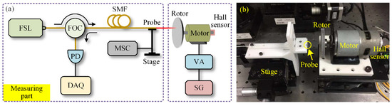To verify the proposed method, an experimental system was built, as shown in Figure 4. The FSL (Arcadia Optronix, GC-760001c, frequency-swept range 196,250 GHz-191,386 GHz, sweeping period 0.486 ms, coherent length < 95 m.) was adopted as the laser source, and the FSI signal detected by the PD was acquired by the DAQ with a sampling rate of 5 MSa/s. The probe was a cleaved single-mode fiber (output laser beam divergence was about 8°). The position of the probe can be adjusted by the motorized stage (adjusting accuracy was better than 1 μm). The rotational motion of the aluminum rotor was provided by the motor. The driving voltage of the motor was generated by the signal generator (DG4102, RIGOL) and amplified by the voltage amplifier (HAS 4011, NF Corporation). The rotational speed was monitored by the Hall sensor installed at the end of the motor.
