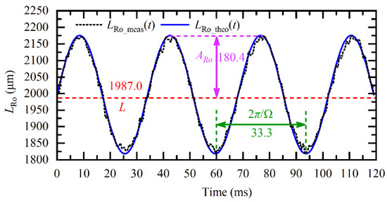 According to Equation (9), after loading the driving voltage, there will be a sinusoidal modulation on the LRo(t) when the rotor rotates. To verify Equation (9), the angular velocity Ω was set to 60π rad/s, and the experimental and theoretical values are plotted in Figure 6. The measured LRo_meas(t) was obtained from the phase slope dψ(t)/dt of the raw FSI signal, and the theoretical LRo_theo(t) was calculated according to Equation (9). It was found that the LRo_meas(t) matches well with the LRo_theo(t). Moreover, comparing Figure 5 and Figure 6, it was also found, due to the rotation-induced Doppler effect, the amplitude of LRo_meas(t) increases to 180.4 μm, which was 3.83 times that of L(θ), and this value agrees well with the theoretical amplitude modulation coefficient (1 + (favgTΩ/B)2)1/2 = 3.79 given by Equation (9).