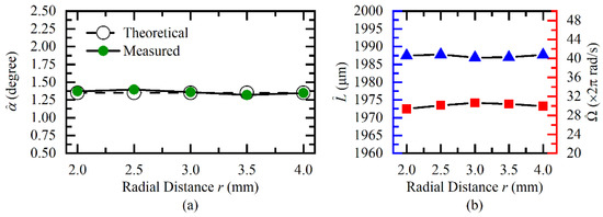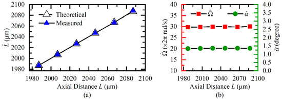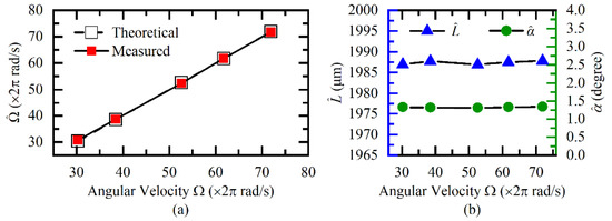 Then, we reset the Ω to the fixed value of 60π rad/s and changed the L by using the motorized stage. The L was changed from 1987 μm to 2087 μm with a step of 20 μm. The measurement results are shown in Figure 8. In Figure 8a, the theoretical L is the sum of the displacement and the initial clearance 1987 μm, and the is obtained according to Equation (11). It was evident that the estimated was consistent with the theoretical L, and the maximum relative measurement error was less than 0.06%. It can be seen from Figure 8b that the estimated and were independent of the variation of . The relative measurement errors of and were respectively less than 0.91% and 1.02%.