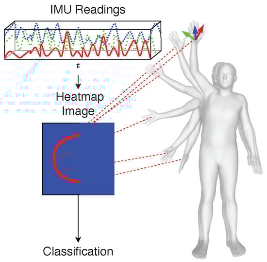 Therefore, an approach is necessary to identify the limbs and/or other body parts’ positions, i.e., poses, and how they change over time regardless of the subject’s spatial positioning. For this, the essential requirement is being able to estimate such poses. Baldi et al. were able to develop an estimator for upper-body pose using IMUs []. Huang et al. developed a whole-body pose estimator with a combination of different IMUs []. Leveraging Huang et al.’s fully body pose estimator, which makes it possible to capture a wide range of body poses, our approach derives 2D heatmaps by tracking single positions and how they change over time. Therefore, our approach can then be used to recognize complex activities regardless of the body part and/or combination.