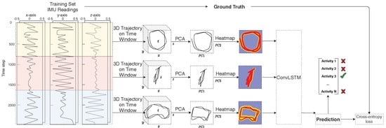 The pipeline describes a function , where S is the set of time series coming from the IMU sensors and A the activity labels, such that is as close as possible to the actual activity performed. To generate the mapping f from IMU sensor time series data to images, the raw sensor data (acceleration and orientation) are first transformed to the global reference frame and then normalized to a local state-of-the-art statistical model called the skinned multi-person linear model (SMPL) []. The standardized raw data are then processed by a method proposed by Huang et al. called deep inertial poser (DIP), where six IMU signals on the wrists, knees, head and lower back are used to estimate a full human body pose []. Specific vertices of the hip-rooted 3D model striking the pose are tracked over time to form trajectories in 3D space. The windowed trajectories are flattened using principal component analysis (PCA) before being fed into the convolutional long short-term memory (ConvLSTM) model responsible for automatic feature extraction and classification. The entire pipeline comprises four key stages: data collection, pose estimation, movement trajectory heatmap generation and classification. A more detailed description for each step is provided in the following subsections.