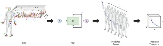 Overview: Left: IMU signals from sensors placed on a human body. Middle: a RNN takes the IMU signals as input and predicts a full body pose from only 6 sensors. Right: the algorithm allows selective tracking for each body part; hence it allows a point-wise trajectory generation.