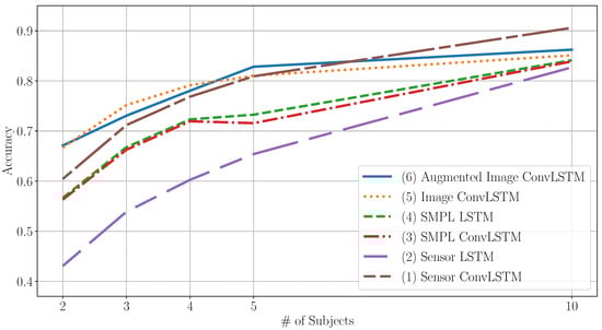 For the validation of the proposed method, we performed experiments using DIP-IMU. To capture the performance power of the proposed approach against reference methods in the field of sensor-based HAR, the following models were drawn for comparison: (1) ConvLSTM and (2) LSTM on the sensor signal; (3) ConvLSTM and (4) LSTM on the SMPL model; ConvLSTM on the generated images (5) without and (6) with DA. The accuracy for the considered cases is plotted in Figure 4 over subsets of the data with different sizes. The leave-one-person-out cross-validation evaluation scheme was adopted to evaluate the approaches.