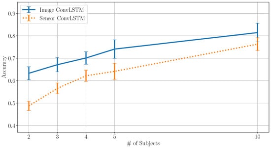 The results show that the ConvLSTM model using heatmap images as inputs consistently achieves higher accuracy levels than LSTM on the raw sensor signal. To account for bias from the SMPL feature extraction, another LSTM model based on the SMPL body parameters was trained, yielding accuracy below the proposed ConvLSTM model using heatmap images. Looking at the results of the one-dimensional ConvLSTM on the raw sensor signal, training on the full dataset yields the highest classification accuracy of 90.6% but underperforms image ConvLSTM for smaller subsets of subjects.