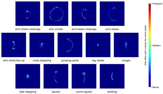 Overall, these results indicate that images are more accessible for human interpretation of the achieved results. For example, taking a closer look at the images generated for the activities “arm circles” and “arm raises”, displayed in Figure 7, which are just a small subsample of the whole sequence on the right wrist, the values of the confusion matrix in Figure 5a indicate good performance. Additionally, the human eye can perceive more detail and make a better distinction between the different movements. On the other hand, images of the activities “squats” and “sumo squats”, which did not perform well, are also confusing for the human eye, since the movements seem slight variations in a planar representation. While IMU-based time series data leave no room for interpretation, motion-based trajectory images are well suited for explaining particular classification behavior.