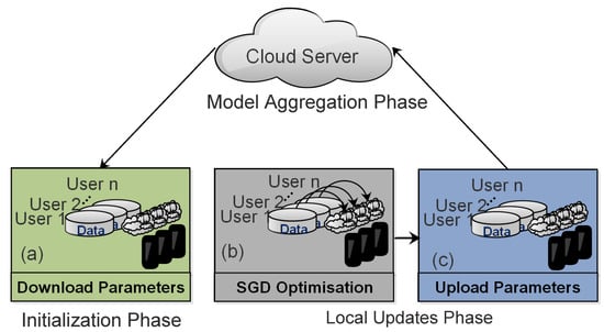 - Kairouz, P.; McMahan, H.B.; Avent, B.; Bellet, A.; Bennis, M.; Bhagoji, A.N.; Bonawitz, K.; Charles, Z.; Cormode, G.; d’Oliveira, R.G.; et al. Advances and open problems in federated learning. arXiv 2019, arXiv:1912.04977. [Google Scholar]