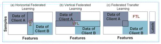 - Vertical Federated Learning (VFL): the VFL is also known as feature-based FL. It is usually applied to the scenario where two datasets need to share identical sample IDs, but different feature spaces. In VFL systems, it is assumed that an adversary between two non-colluding parties can compromise a client’s privacy. The adversary learns the data from the corrupted party, while the data of the other party remains secure.