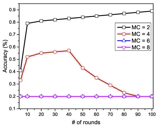 - Nishio, T.; Yonetani, R. Client selection for federated learning with heterogeneous resources in mobile edge. In Proceedings of the ICC 2019—2019 IEEE International Conference on Communications (ICC), Shanghai, China, 21–23 May 2019; pp. 1–7. [Google Scholar]