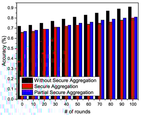 - Segal, A.; Marcedone, A.; Kreuter, B.; Ramage, D.; McMahan, H.B.; Seth, K.; Patel, S.; Bonawitz, K.; Ivanov, V. Practical secure aggregation for privacy-preserving machine learning. In Proceedings of the 2017 ACM SIGSAC Conference on Computer and Communications Security, Dallas, TX, USA, 30 October–3 November 2017. [Google Scholar]
