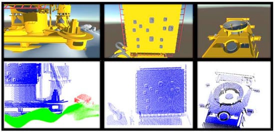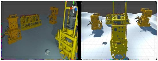The 3D models used were two subsea Christmas tree models, a manifold (equipment used for oil field simplification), a crab (disproportionately enlarged for easy viewing here), and the sandy soil. Within this scene, the sensor’s path was chosen to scan the targets in their entirety. The virtual scanning resulted in a series of point clouds equivalent to the 3D models of subsea equipment. Figure 12 shows the virtual scene, and Figure 13 shows the point clouds generated.