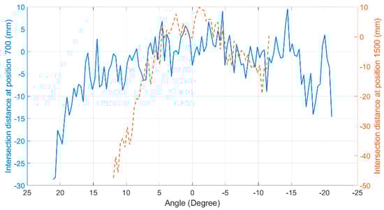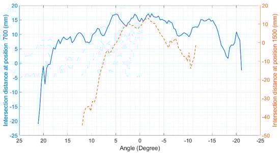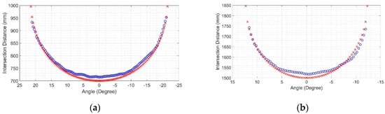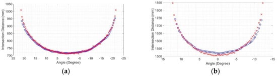 Intersection maps: (a) At 700 mm of the sensor’s central ray; (b) At 1500 mm of the sensor’s central ray. In both plots, the intersection points of the Hokuyo LiDAR are marked with “o”, while those of the Sensor Simulator (measurement model) are marked with ‘x’ [29].