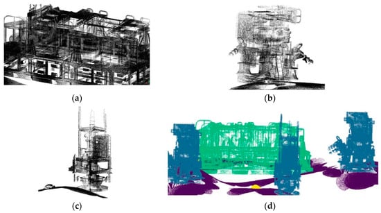 - 3D coordinates: Define the position of the point associated with the constructed virtual scene (x, y, z). It is the basic information of a point cloud. The visualization of the points is shown in Figure 6a;
