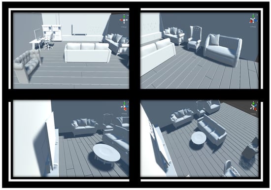 Virtual scene of a living room. The frames display four positions out of a total of eighteen for the virtual sensor [28]. All 3D models were obtained from Free3D [35].