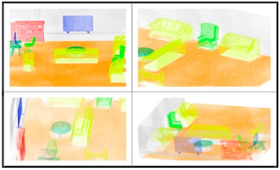 Synthetic point cloud generated with semantic classification seen at different angles. Classes: Red—Bookcase, Yellow—Sofa, Dark green—Table, Light green—Chair, Blue—Monitor/TV, Gray—Wall, and Orange—Floor [29].