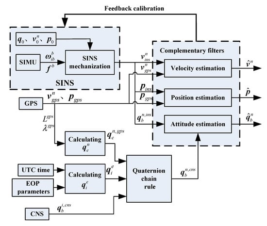 Compared with FKF, the design of complementary filter (CF) is based on the frequency-domain characteristics of navigation errors of each subsystem, and it does not require the exact system model and noise statistics. The CF filter has the advantages of a simple algorithm, low computational load, good real-time computations, etc. When it is used in an integrated navigation system, CF can achieve the closely same filtering precision as FKF [,,]. In this paper, a novel information fusion method based on complementary filter is proposed for an SINS/CNS/GPS integrated navigation system to improve both the computational efficiency and real-time performance. By utilizing the method of CF filtering, the attitude/speed/position estimations of a SINS/CNS/GPS integrated navigation system are realized, respectively. In addition, the proposed information fusion method has the advantages of low computation load, good stability, and steady-state accuracy, which meet the requirements of an integrated navigation system for an aerospace plane.