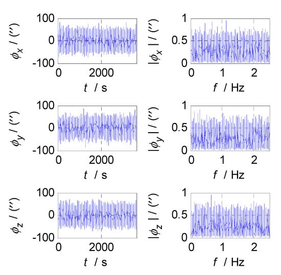 Firstly, analyze and select the cut-off frequency of the complementary filter for attitude estimation (i.e., the cut-off frequency of CF1). The attitude errors of SINS and CNS subsystems obtained in the static test are analyzed in time and frequency domain, and the analysis results are shown in Figure 3, Figure 4 and Figure 5 where , , and denote the pitch, roll, and yaw misalignment angles, respectively, the unit of which is arcsecond (″); denotes the time axis, and its unit is second (s); , and denote the amplitudes of the pitch, roll, and yaw error spectrums, the unit of which is arcsecond (″); denotes the frequency axis, its unit is Hertz (); , , and denote the standard deviations of attitude errors in SINS/CNS integration, and denotes the cut-off frequency of CF1. Figure 3 shows the time curves and amplitude spectrums of CNS attitude errors, of which the three subfigures on the left are the time curves, and three subfigures on the right are the amplitude spectrums. Figure 4 shows the time curves and amplitude spectrums of SINS attitude errors. Similarly, the three subfigures on the left are the time curves, and the three subfigures on the right are the amplitude spectrums. It can be seen from Figure 3 to Figure 4 that the attitude errors of CNS do not diverge and are less than 100″, while the time curves of attitude errors are characterized by disorderly jumping noise. According to the corresponding amplitude spectrums, the errors of CNS can be approximated as white noise. The attitude errors of SINS have a tendency to oscillate and diverge, which are close to in 3600 s. From the amplitude spectrums, it can be seen that the attitude errors of SINS are mainly distributed in the low frequency band of 0–1 Hz. In order to obtain the statistical relationship between the cut-off frequency and attitude estimation accuracy , let take different values, and Monte-Carlo simulation is performed to record the corresponding values of () and every time. Selection of value points: the cut-off frequency value points are in the frequency range of 0 to 2.5 Hz, while the interval between two adjacent cut-off frequency points is taken as 0.03 Hz. In addition, the three frequency points of 0.001, 0.005, and 0.01 Hz are also tested. This means that the set of value points is . According to the statistical results of Monte-Carlo simulation, the relationships between and () are obtained. As shown in Figure 5, the effect of cut-off frequency on the attitude error can be seen. The data pairs including the minimum values of () and corresponding are pitch (0.09 Hz, 0.2116’), roll (0.09 Hz, 0.2140’), and yaw (0.12 Hz, 0.2121’), which are marked with red asterisks(*) in Figure 5. It can be seen that the cut-off frequencies corresponding to the minimum values of three attitude errors are very close. In order to reduce the algorithmic complexity and computational load, the same cut-off frequency values are selected for the pitch, roll, and yaw estimations, i.e., , .