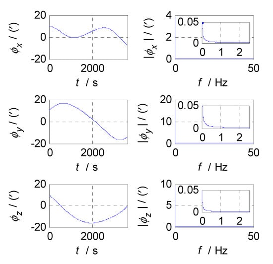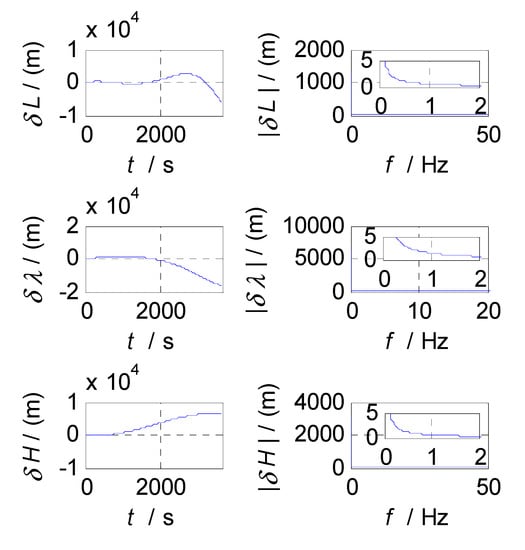 In order to determine the cut-off frequencies of complementary filters for the attitude/velocity/position estimation in an SINS/CNS/GPS integrated navigation system, the frequency-domain analyses were conducted on the measurement errors of SINS, CNS, and GPS subsystems. The analysis results, which include the error curves, amplitude-frequency diagrams, and relationship graphs between the estimation errors and selected cut-off frequencies, are shown in Figure 3, Figure 4, Figure 5, Figure 6, Figure 7, Figure 8, Figure 9, Figure 10 and Figure 11, respectively.