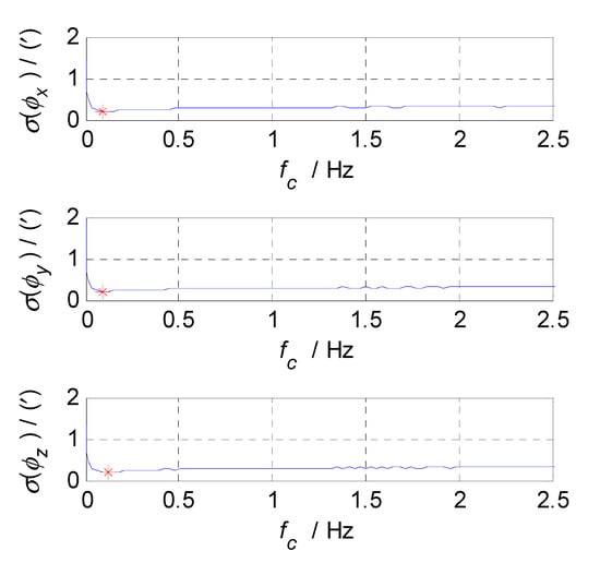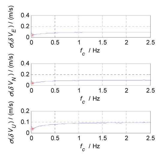 The minimum standard deviations of navigation parameters and corresponding cut-off frequencies are summarized in Table 1. Finally, the values of , , and are determined as 0.1, 0.03, and 0.12 Hz, respectively.