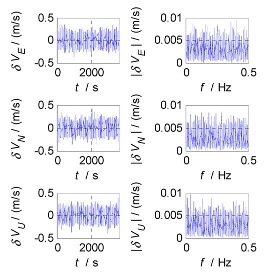 Due to the measurement noises of inertial sensors and the calculation error of the SINS update algorithm, there will be white noise in the velocity information of SINS, which could be denoted as , and its variance intensity is denoted as . The power spectral density of is , and the position random walk noise of SINS is the integral of velocity white noise; its power spectral density is as follows: