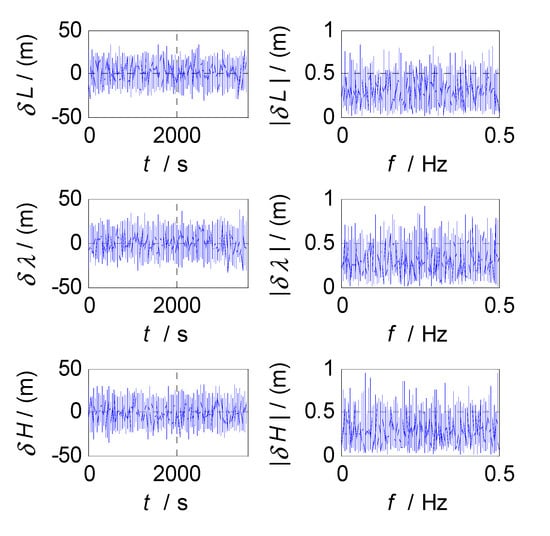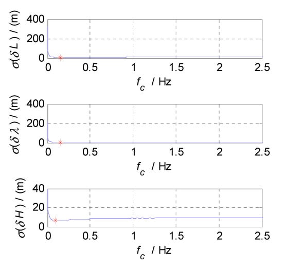 Finally, the cut-off frequency is selected for position estimation (i.e., the cut-off frequency of CF3, ). The position errors of SINS and GPS subsystems obtained in the static test are analyzed in time and frequency domain, and the analysis results are shown in Figure 9, Figure 10 and Figure 11. Thereinto, , , and denote the latitude, longitude, and altitude errors, respectively, the unit of which is meter (); denotes the time axis, and its unit is second (); , , and denote the amplitude spectrums of latitude, longitude, and altitude errors, the unit of which is meter (); denotes the frequency axis, its unit is Hertz (); , , and denote the standard deviations of position errors in SINS/GPS integration; and denotes the cut-off frequency of CF3. Figure 9 shows the time curves and amplitude spectrums of GPS position errors, of which three subfigures on the left are the time curves, and three subfigures on the right are the amplitude spectrums. Figure 10 shows the time curves and amplitude spectrums of SINS position errors. Similarly, the three subfigures on the left are the time curves, and the three subfigures on the right are the amplitude spectrums. It can be seen from Figure 9 and Figure 10 that the position errors of GPS do not diverge and are less than , while the time curves of the GPS position errors are characterized by disorderly jumping noise. According to the corresponding amplitude spectrums, the position errors of GPS can be approximated as Gaussian white noise. The position errors of SINS will oscillate and diverge, which are close to the order of magnitude of at 3600 s. As seen from the amplitude spectrum, the position errors of SINS are mainly distributed in the low frequency band of 0 to 2 Hz. Similarly, in order to obtain a statistical relationship between the cut-off frequency and position estimation accuracy, let the cut-off frequency take different values, and Monte-Carlo simulation is performed to record the values of () and corresponding ; the selection of value points is the same as that of . According to the statistical results of Monte-Carlo simulation, the relationships between and () are obtained. As shown in Figure 11, the effect of cut-off frequency on the position errors of SINS/GPS integration can be seen. The data pairs including the minimum values of and corresponding are latitude , longitude , and altitude , which are marked with red asterisks(*) in Figure 11. The cut-off frequencies corresponding to the minimum values of the latitude, longitude, and altitude errors are very close. Based on the analysis above, the value of can be selected as , .