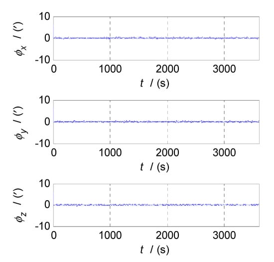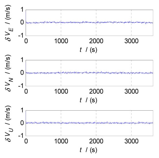 The semi-physical simulation of the proposed CF-based SINS/CNS/GPS integrated navigation algorithm is performed, and the navigation errors obtained by comparing the integrated navigation results with the corresponding trajectory parameters generated by the trajectory generator are shown in Figure 13, Figure 14 and Figure 15. Figure 13, Figure 14 and Figure 15 show the time curves of attitude errors, velocity errors, and position errors, respectively. According to the statistics of errors, the standard deviations of pitch, roll, and azimuth errors are , , ; the standard deviations of velocity errors in the East, North, and Up directions are , , and ; the standard deviations of position errors in latitude, longitude, and altitude are , , and .