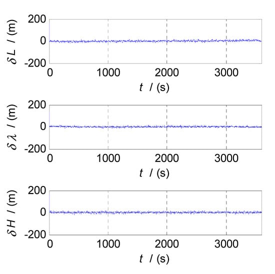 From Figure 13, Figure 14, Figure 15, when the CF processes of INS/CNS/GPS integration navigation start, the curves of attitude errors, velocity errors, and position errors converge quickly, and the noise components of navigation errors are basically filtered out. Throughout the process of simulation, the navigation parameters output by the CF-based SINS/CNS/GPS integrated navigation system remain convergent. The attitude errors are less than , the velocity errors are less than , and the position errors are less than . The errors of navigation parameters are all within the acceptable range. So, the proposed method of CF-based information fusion can meet the requirements of long-term and high-precision navigation for an SINS/CNS/GPS integrated navigation system of an aerospace plane.