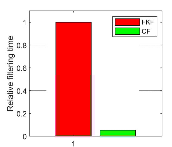 In order to investigate the real-time performance of the proposed CF-based information fusion algorithm for SINS/CNS/GPS integrated navigation, the average single-time elapsed times of the FKF and CF are recorded by using TIC and TOC functions of MATLAB. Denote the average single-time elapsed times of the FKF and CF as and , respectively. According to the recorded time, we have and . In order to eliminate the effect resulted from the difference of computer performances, the relative elapsed times of FKF and CF are defined as: