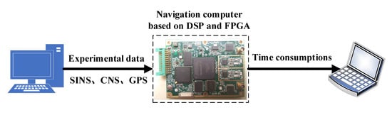 In order to further verify the priorities of a proposed CF-based information fusion algorithm in terms of computational complexity and real-time performance, an experimental test based on a real-time system was conducted. The data processing architecture of a real-time system is shown in Figure 17, in which the navigation computer mainly includes Digital Signal Processor (DSP, Texas Instruments, TMS320C6748), Field Programmable Gate Array (FPGA, Altera, Cyclone V 5CEFA9F23I7N), Analog-to-Digital Converter (ADC, Analog Devices Inc., Norwood, MA, USA, AD9288), etc. The DSP chip is used to calculate the information fusion algorithms of SINS/CNS/GPS integrated navigation. The experimental process is as follows: Firstly, a frame of experimental data (including the data of SINS, CNS, and GPS) generated by semi-physical simulation is input into the DSP chip through the RS232/422 serial communication interface of the navigation computer. Subsequently, the two information fusion algorithms of SINS/CNS/GPS integrated navigation based on CF and FKF are carried out by the DSP chip, respectively. Eventually, the recorded time consumptions are output to a terminal display device.