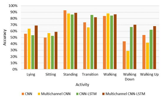 Figure 2 summarizes the accuracy of each class predicted by these models. As we can see, among all these classifiers, the multichannel CNN-LSTM performed approximately equally on each class. Although larger weights were assigned to the minority classes to aid the training, walking up and down were classified with a lower accuracy irrespective of the kind of classifier used. This is also illustrated by the confusion matrices in Table A6, Table A7, Table A8 and Table A9 (see Appendix A), which illustrates that walking up and down were mostly misclassified as level walking, with false negative rates of 28.8%, 36.30%, 25.5%, and 13.3% for walking up; and 37.0%, 55.6%, 19.7%, and 16.8% for walking down for the 1D CNN, multichannel CNN, CNN-LSTM, and multichannel CNN-LSTM models, respectively. Sitting, as one of the majority class, also had a lower classification accuracy with an average of 58.3% over all the classifiers, and this activity was mostly confused with lying (see Table A6, Table A7, Table A8 and Table A9). The cause for this observation may be that these two activities did not involve motion and cause the smartphone in the pants pocket to have a similar sensor orientation, so it would be challenging to differentiate them using acceleration data. In addition, since the lying activity was always followed by the sitting activity (see Table A1 in Appendix A), the 200 data points in segments for lying might contain data for sitting, confounding the features. This notion is strengthened by the fact that the other static activity, standing, was assigned to a smaller weight but achieved a high accuracy (93.6% for 1D CNN, 88.5% for multichannel CNN, 86.3% for CNN-LSTM, and 88.9% for multichannel CNN-LSTM). This is promising because instead of standing quietly, participants actually performed daily-life tasks such as filling a glass of water, washing their hands, etc., which involved bodily motions analogue to their habitual performance in daily life.