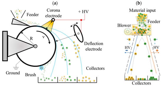 Illustration of electrostatic separation process in the example of a drum type separator (a) and free-fall type (b).