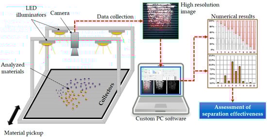 An alternative method employing a dedicated vision system in the research on the separation of polymers is proposed. The concept is based on methods that use samples of materials of a different colour. The idea is schematically illustrated in Figure 2. The system consists of a segmented collector of the separated material, a camera, a lighting system and a PC with a developed computer code.