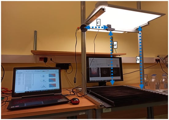 The concept of utilizing a vision system for the rapid assessment of electrostatic separation effectiveness is mainly based on using dedicated sample materials that differ in colour. The mixture of these sample materials is used to study the impact of the process parameters on the quality of this separation. Such a fast method of assessing the effectiveness of the separation, provided by the vision system, allows the determination of “optimal parameters” in the process of separating selected materials. The proposed vision system for the rapid assessment of the separation effectiveness is based on a CMOS camera and in-house developed software running on a standard PC. The camera resolution was 1920 × 1080 px. The codec H.264 was used for compression. The camera was installed on a frame made of aluminium profiles, thanks to which it was possible to adjust its field of view. To minimize the impact of ambient light conditions the working space was illuminated with a 20W LED panel. The test stand had the following dimensions: c = 300 mm, a = 600 mm, b = 670 mm—see Figure 3. The separated material was placed in a number of collectors (see Figure 4) made of aluminium C-profiles forming a material pickup. For testing purposes, in order to avoid reflections, the collectors were painted with matte black paint. The test rig and components of the developed vision system have been shown in Figure 3.