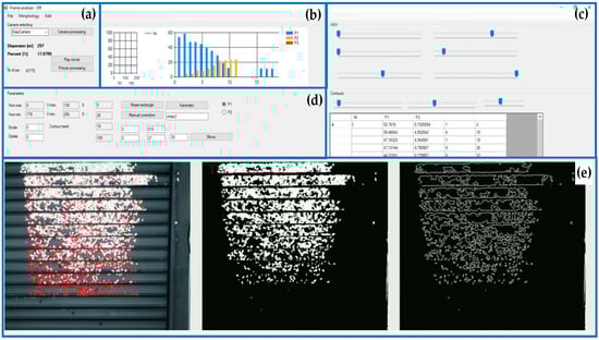 Material pickup consisting of 18 regions of interest (ROIs) filled with sample materials: (a) camera selection, (b) data visualization (preview), (c) HSV colour settings, (d) ROI parameter selection, (e) camera view (before and after image processing).