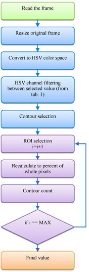 The in-house code for image processing was written in the C# programming language using OpenCV libraries. During the first stage of the development of the system, an algorithm was calibrated and the individual HSV data for a specific material and lighting conditions were determined. After the image is loaded, the defined segment ROI is cut out for further analysis. The dimensions of a single ROI are 510–27 px. Then, each ROI is filtered using previously calibrated values taken from the HSV colour model. During the next step the numerical representation of the material content is calculated. Two indicators were used for the assessment of the separation effectiveness. The first is defined by the percentage of pixels with a certain colour occupying a given image segment (ROI). The second parameter describes the number of contours found in the filtrated image. This parameter was defined as the degree of dispersion. Thanks to a high degree of dispersion it was possible to notice that a given material was clearly grouped in specific zones. Nevertheless, it should be treated as an auxiliary value. The image processing was performed according to the algorithm shown in Figure 5.