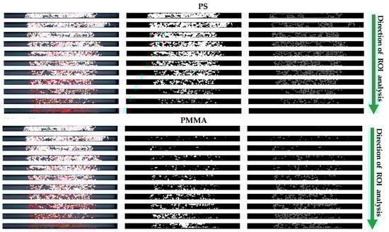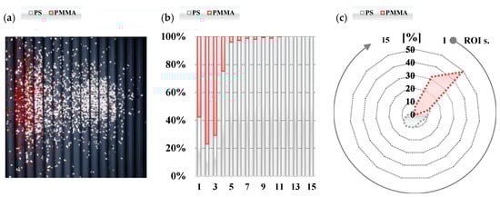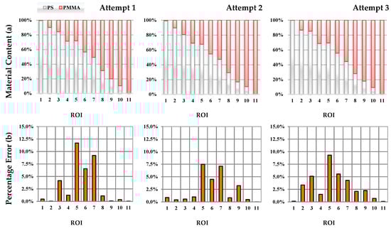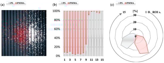 Three measurement attempts were conducted. At each attempt, the material in individual collectors was randomly dispersed. The percentage contents of PS and PMMA materials in each ROI were determined and are shown in Figure 9.