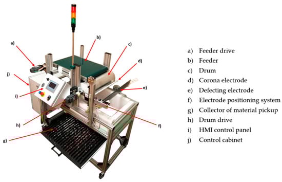 The test stand is equipped with corona and deflection high voltage electrodes. The corona electrode has the ability to move along two coplanar axes to the drum base. The use of the stepper motor enables maintaining the desired position during the separation process. The deflection electrode has also the ability to change positions and rotation (manually). In the case when input material is tribocharged, the corona electrode can be removed and its automated positioning system can be utilized to control the localization of the deflection electrode without manual operations. In other words, the test bench can operate in two modes, i.e., as a typical drum type separator (corona charging mode) and as a semi-freefall type separator when the corona electrode is removed and material is tribocharged using an external device (tribocharging mode).