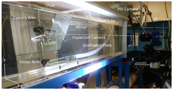 The DIV meter was calibrated using a flow visualization flume equipped with a PIV system and located at the Fluid Mechanics Laboratory in the University of Victoria, Victoria, BC, Canada. The velocity operating range of the flume was not quite low enough for the test. Therefore, a 40 mm diameter flexible tube was placed near the injector and discharged the flow generated by a COPBB5 SHURflo Pedestal Mount centrifugal pump run by a Parker MPP1003D1E-KPSN motor. The tube was placed behind the injector so that the middle of the tube and the tip of the injector were at the same height. In this way, the injected dye was subjected to the highest discharged velocity. Various flow rates and thus flow velocities, were obtained by changing the rotor speed. The plane of interest for the PIV was parallel to the graduated plate, at a height equal to that of the center of the tube and the injector’s tip. Image shifting via a flat mirror was utilized for the PIV camera to overcome the optical restrictions. The mirror has an axial rotation around the y-axis at an angle of = 45 to prevent distortion. The camera field of view was set to capture the dye path in the middle to minimize any velocity shift [16]. Furthermore, the main velocity component, which is parallel to the rotation axis of the mirror (y-direction) is expected to be less sensitive to velocity shifts [17]. Moreover, the water level was set high enough to prevent any surface effects. Figure 1 demonstrates the calibration test setup configuration. The dashed line in the Figure 1 shows how the image was shifted by the mirror. The PIV camera was situated beside the flume recording the images and the laser was next to it at a lower height. It should be noted that the mirror and its supporting parts were only used for the calibration test and they are not part of the DIV.