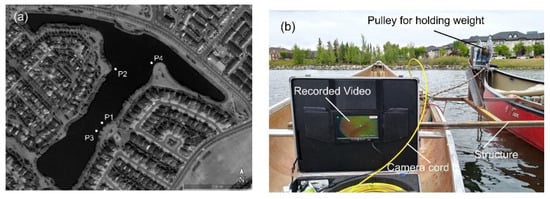 (a) Data collection locations in the Inverness pond (background photo extracted from Google Earth); (b) validation setup.