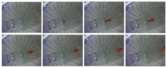 Transport of dye at an estimated speed equal to 0.14 m/s (prior to calibration) at (a) t = 0; (b) t = 0.380 s; (c) t = 0.619 s; (d) t = 0.710 s; (e) t = 0.928 s; (f) t = 1.244 s; (g) t = 1.520 s; and (h) t = 1.839 s.