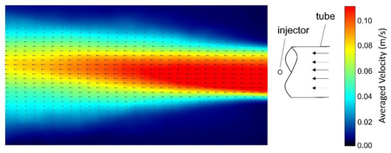 The PIV system consists of Davis LaVision 10.0.1 software utilized for raw image acquisition and calculations of velocity vectors. Particles with a mean diameter of 10 µm were illuminated by the Quantel Evergreen Nd:YAG 532 nm wavelength dual pulsed laser. The laser beam was expanded into a planar sheet that illuminated the data acquisition plane (DAP). Images of the DAP were recorded using a LaVision XS 6M camera equipped with a lens with the focal length of 50 mm and a 532-nm narrow-band filter, at an acquisition rate of 13 Hz. The field of view of the images corresponded to the spatial domain was 160 mm × 80 mm. The resolution of raw image was 2752 pixels × 2200 pixels. The captured raw images were processed with a final interrogation window size of 64 × 64 pixels with 75% overlap applied throughout the multi-pass vector calculation process [18]. The spatial resolution of the resulting velocity vector field was 0.76 vectors/mm. Averaged velocity field was calculated by averaging 300 instantaneous velocity fields at each flow velocity. For the purpose of calibration, the PIV vectors from the averaged field were spatially averaged along a straight line between 2 and 18 cm far from the injector, respectively.