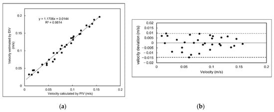 Eleven data points in the second round and 10 data points during each of the other rounds were collected, making the total number of the data points equal to 31. The calibration curve of the DIV for all of the data was obtained and shown in Figure 5a. The R2 value of the calibration curve is more than 0.98, indicating a successful calibration and that the instrument can be reliably used to measure flow velocities.