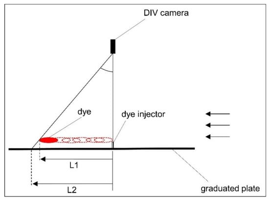 Comparing the velocity values estimated by the DIV and PIV, it was found that the DIV overestimated the velocity, for likely two reasons. First, due to turbulence and unsteady flow velocity in the dye pathline, the travel time that is recorded is the time for the fastest particles in the dye stream. Second, the dye is injected just above the plate and the DIV camera, which is located above the dye injector, observes the dye stream and plate beneath it from an angle that becomes more and more skewed as the dye progresses with the flow stream. This angle leads to a velocity overestimation and is illustrated in Figure 6. At the moment in time shown in Figure 6, DIV estimates the travelled distance to be equal to L2, whereas, the actual travel distance is L1 (and L1 < L2). This causes an underestimation in the dye travel time, which results in overestimation of flow velocity.