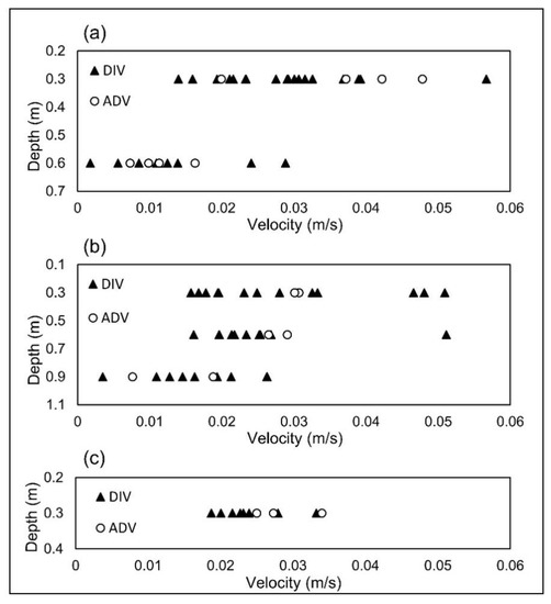In order to compare the velocity magnitude data measured by the DIV and ADV, a Mann-Whitney test was performed. The p-value obtained for the difference in velocity magnitudes was larger than 0.05 in all of the spatial points; thus, indicating that the differences between the data are not statistically significant. In addition, the averaged values were compared and good agreement was observed. The lowest deviation between the averaged DIV and ADV occurred at the highest velocities recorded at P1 and P2 at both a 0.3 m depth. The percentage of those deviations are the lowest as well; equal to 4% and 5%, respectively. Conversely, the highest deviation between the averaged DIV and ADV measurements was equal to 0.0048 m/s, which occurred at location P3 at depth 0.3 m. However, the highest percentage in deviation was associated with P2 at a depth of 0.9 m and was equal to 27%. The velocity at this spatial point was close to the low end of the detection range and high uncertainty at the low end of the range was to be expected [19]. In addition, at this spatial point, the flow direction data were the most relatively dispersed as shown in Figure 8b. At low velocities, even small eddies can change velocity direction substantially. Therefore, low velocities may include higher random errors.