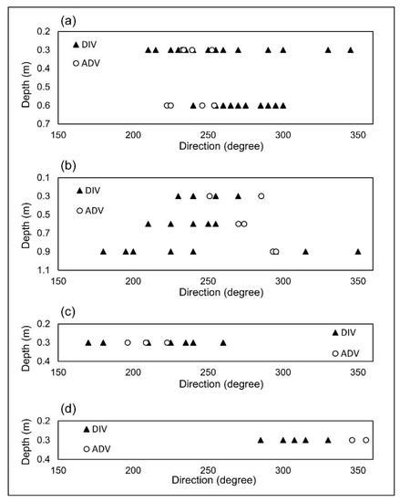 The flow direction was shown in a trigonometric format (East = 0 and North = 90) in Figure 8. A Mann-Whitney test was also performed on flow directions estimated by the DIV and ADV. In 5 out of 7 spatial points the data were not significantly different (p-value > 0.05). However, at P1 and P2 and both at depth 0.6 m, the differences were significant. P1 at depth 0.6 m had a relatively low velocity, in which eddies can have a greater impact on the flow and thus change the flow direction. Other sources of error may have also contributed to difference in the data at P2 at a depth of 0.6 m. It should be noted that each ADV data point in Figure 7 and Figure 8 is the average velocity of 80 collected samples over 40 s with spikes filtered out automatically by the instrument. However, each data point corresponding to the DIV shows the flow velocity magnitude or direction for only one injection of the dye. For all of the spatial points the deviations of flow direction between the DIV and ADV measurements were less than 14%—the value equal to the corresponding deviation at P2 at a depth of 0.9 m. This demonstrates a good overall agreement in direction between the two devices.