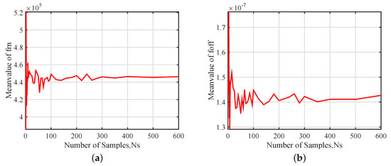 In this study, we focus on the uncertainty in four parameters: the length L, width B, thickness H and single concentrated mass of the comb finger of the resonant beam. The uncertainty of all the input parameters is assumed to obey the Gaussian distribution, which is commonly used to represent uncertain parameters of a physical model [20,26]. After determining the distribution of the input parameters, the Monte Carlo sampling method (MCS) is used to randomly select the input parameters from the given Gaussian distribution to obtain a sample combination. In the process of stochastic convergence analysis, with the increase of the number of samples, the mean value and standard deviation of input parameters will converge to the nominal mean value and standard deviation of Gaussian distribution, then the minimum sample value of input parameters will be obtained. To measure the uncertainty of input parameters, the coefficient of variance (COV) defined as represents the uncertainty degree of the input parameters, where the average value is represented by the nominal value of the uncertainty parameters, and the standard deviation represents the variability of the input parameters.