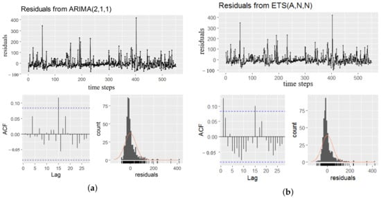 Comparisons between ARIMA and ETS models (a): ARIMA model, (b): ETS model.