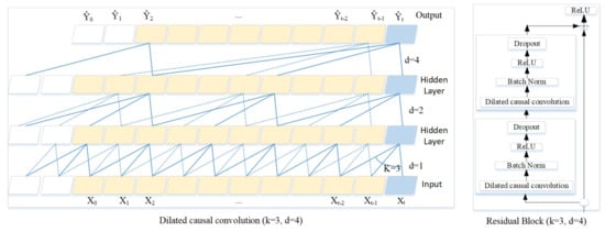 The TCN model combining dilated and causal convolutional layers that was presented ensured that the previous time step will not use future information because the output of time step was obtained based on . TCN can be viewed as 1D FCN plus one-dimensional causal convolutions, and each two convolutional layers and identity mapping are encapsulated into a residual module. The residual module then stacks the deep network, and uses fully convolutional layers in the last few layers. Dilated convolution enlarges the receptive field exponentially []. We simplified the TCN model’s highlights using Equation (3). Dilated convolution operation F on elements of the sequence X is defined as: